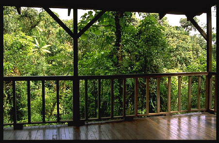 Birds of many kinds were already active in the canopy, especially in two trees to the left of the deck. From high in the treetops, parrots and parakeets were squawking and feeding not just themselves but dozens of other creatures, with the fruit they carelessly dropped and scattered across the forest floor. With my binoculars, I saw more than a dozen other species but could identify only a couple without the field guide left on the stand beside the bed. After a few minutes taking in the air, always pleasant with a mingling of decay and perfume, my mind turned to coffee and breakfast at the Rara Avis lodge.